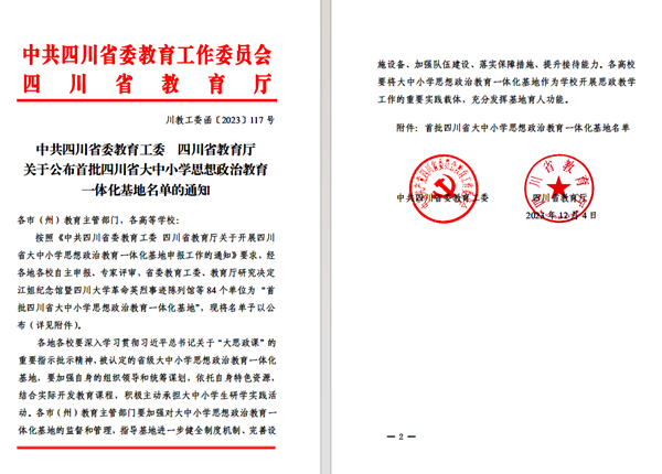 党的二十大报告明确指出,要办好人民满意的教育,用社会主义核心价值观铸魂育人,完善思想政治工作体系,推进大中小学思想政治教育一体化建设。四川省大中小学思想政治教育一体化基地的认定是深入推进大中小学思想政治教育一体化建设,全面增强思政育人实效的重要举措,落实立德树人根本任务、办好人民满意教育的实干之举。