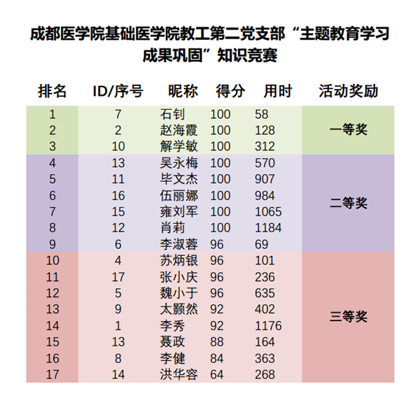 本次竞赛题目主要从习近平总书记二十大报告、习近平新时代中国特色社会主义思想、主题教育应知应会相关内容中选取,利用“问卷星”网络平台进行在线答题。党员同志们赛前认真准备,积极踊跃参加,营造出了浓厚的学习和答题氛围,受到大家一致好评。最终,按本次答题的得分高低排序,评选出了一、二、三等奖并颁发了活动奖品。