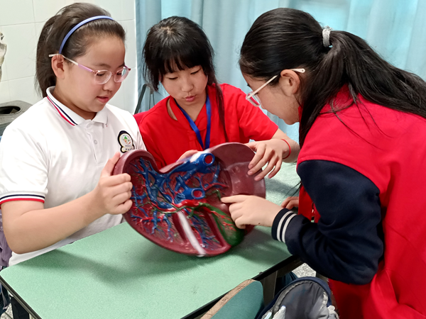 接下来,志愿者通过模型展示,让同学们全面了解了心脏、肝脏、肺的组成以及各自的功能。同学们认真听讲,通过近距离接触模型,对各个器官在日常生活中的重要作用有了进一步的认识和了解。