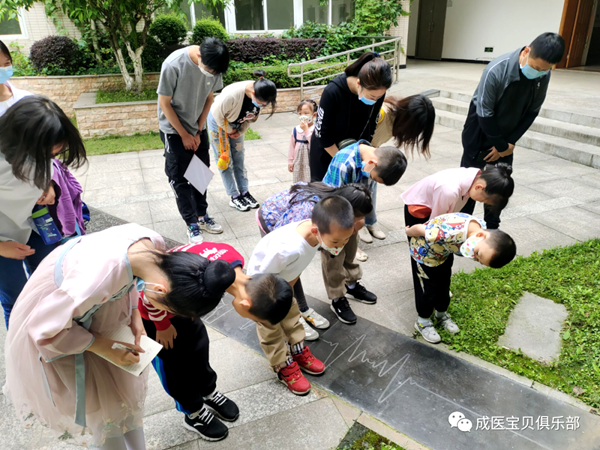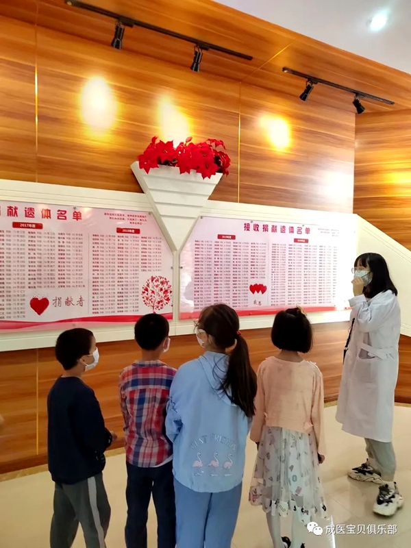 在这一间小小的感念堂,里面张贴着2010年至今公司接受的遗体捐赠者的名单。他们生前为国为家奉献自己的聪明才智,离世时,他们又将身体奉献给了医学教育事业,用尽最后一丝力量点亮生命、温润世界。小朋友和家长们在无字碑前对这些伟大的人们表达了深深地感谢和敬意。