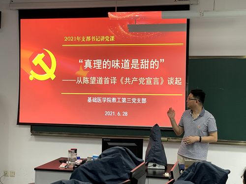6月28日,304永利集团登录入口教工第三党支部开展“支部书记讲党课”活动。支部书记唐瑜同志以《“真理的味道是甜的”——从陈望道首译<共产党宣言>谈起》为题,给全体支部成员带来了一堂生动的党课。