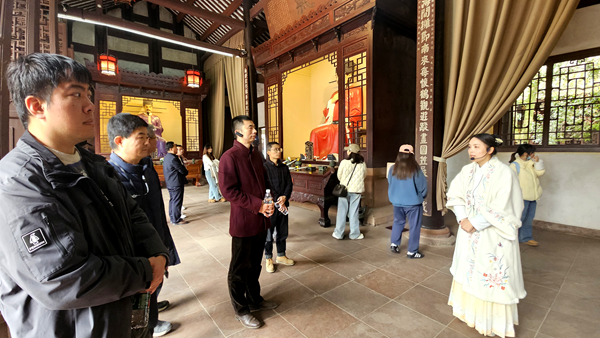 在三苏祠内,党员们跟随讲解员的脚步,先后参观了飨殿、启贤堂、来凤轩、三苏雕像等重要景点。在参观过程中,讲解员详细介绍了三苏父子的生平事迹、文学成就以及廉政为民理念。党员们认真聆听,不时驻足观看展品和楹联,深刻感受到了三苏文化的博大精深。