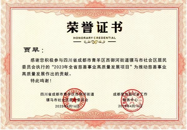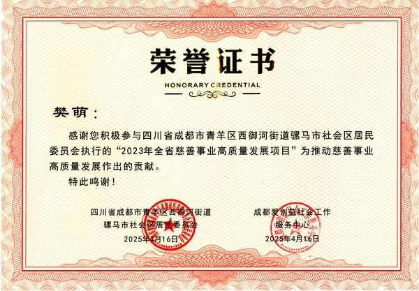 信里表示,公司304永利集团登录入口病理学与病理生理学教研室樊萌、贾翠两名同志,充分发挥自身医学专业优势,积极参与青羊区骡马市社区慈善事业建设。该社区被省民政厅、省财政厅评为“2023年全省慈善事业高质量发展二等慈善社区”。社区基于两名同志为推动慈善事业高质量发展所作出的贡献,颁发荣誉证书,表示诚挚感谢。